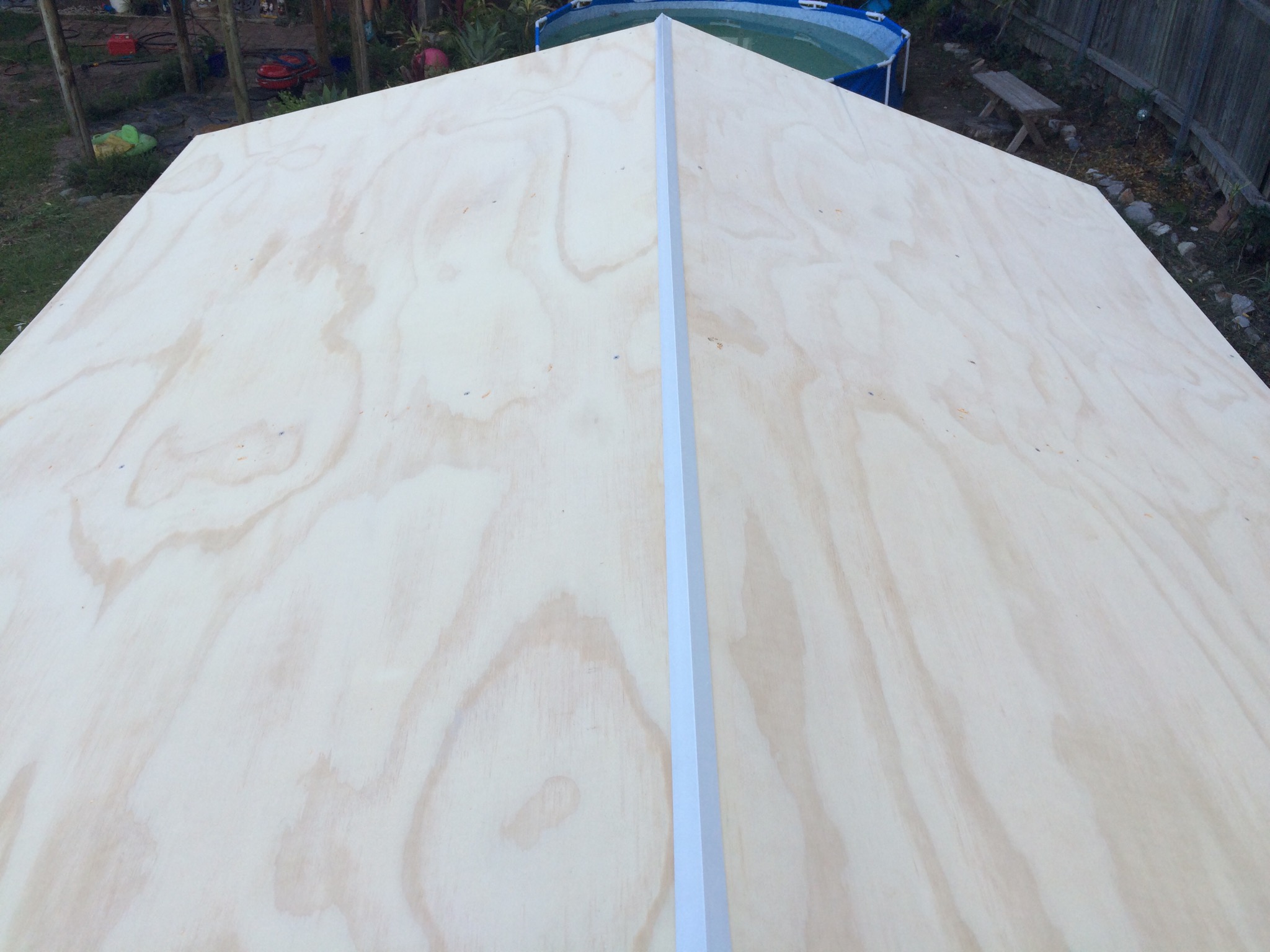 I had been trying to align the two sheets of ply to the centre of the front truss. The only way I could get it to work was to align to the ends of the rafters along the side walls. This got it as even as I could.