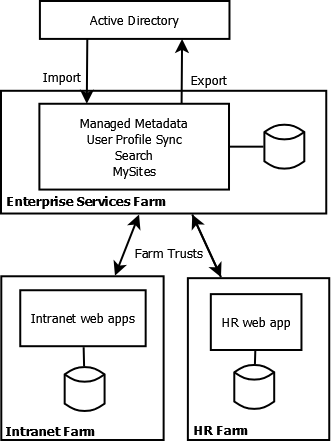 Following this idea, I have planned out how I would like to see this work in my current environment, I also have the added requirement that HR may potentially wish to have their own, secure farm. This helps support my arguement going forward, and allows us to be flexible: